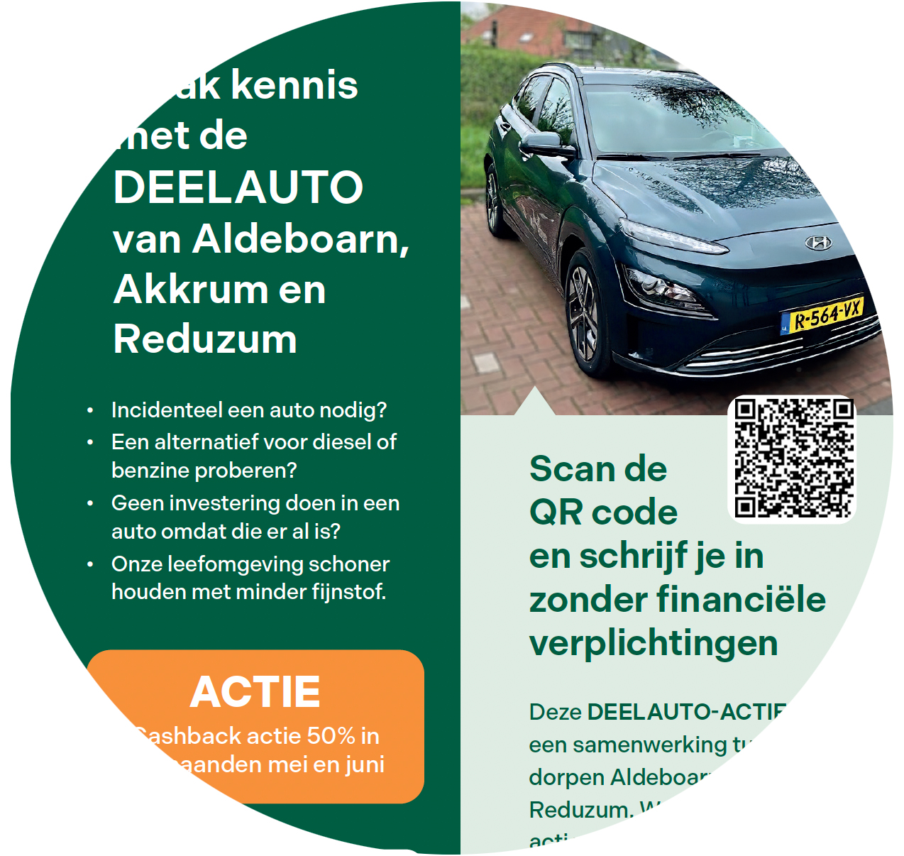 Deze deelauto-actie is een samenwerking tussen de dorpen Aldeboarn, Akkrum en Reduzum. We willen de deelauto extra onder de aandacht brengen door in mei en juni 50% geld terug te geven op de ritkosten.